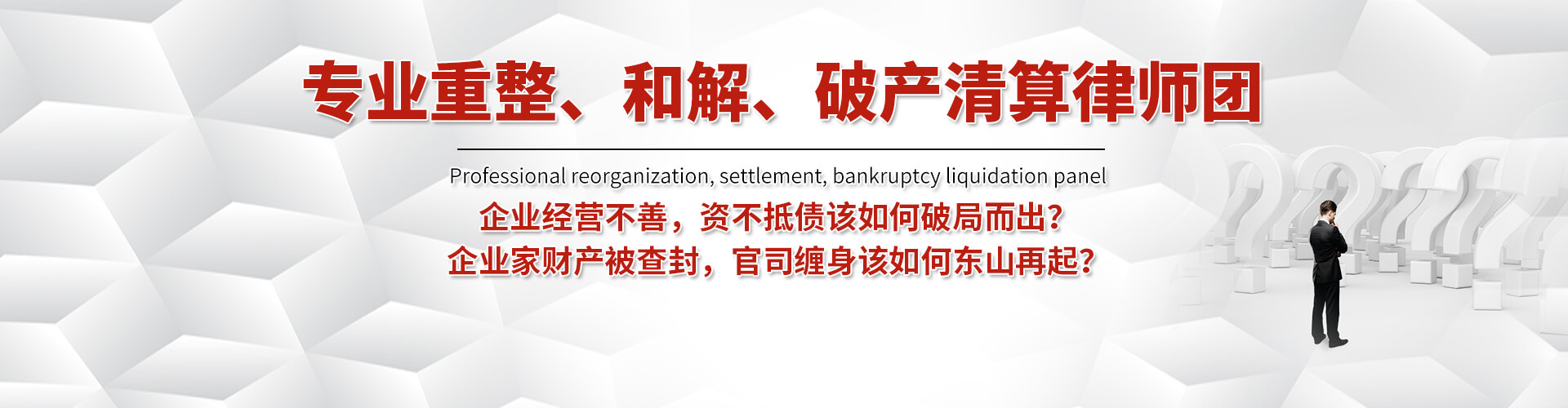 免費咨詢 點擊查看詳情 提供重整、和解、解散、清算相關法律設計方案;提供企業員工轉移、解散與安置相關方案設計與方案落實;